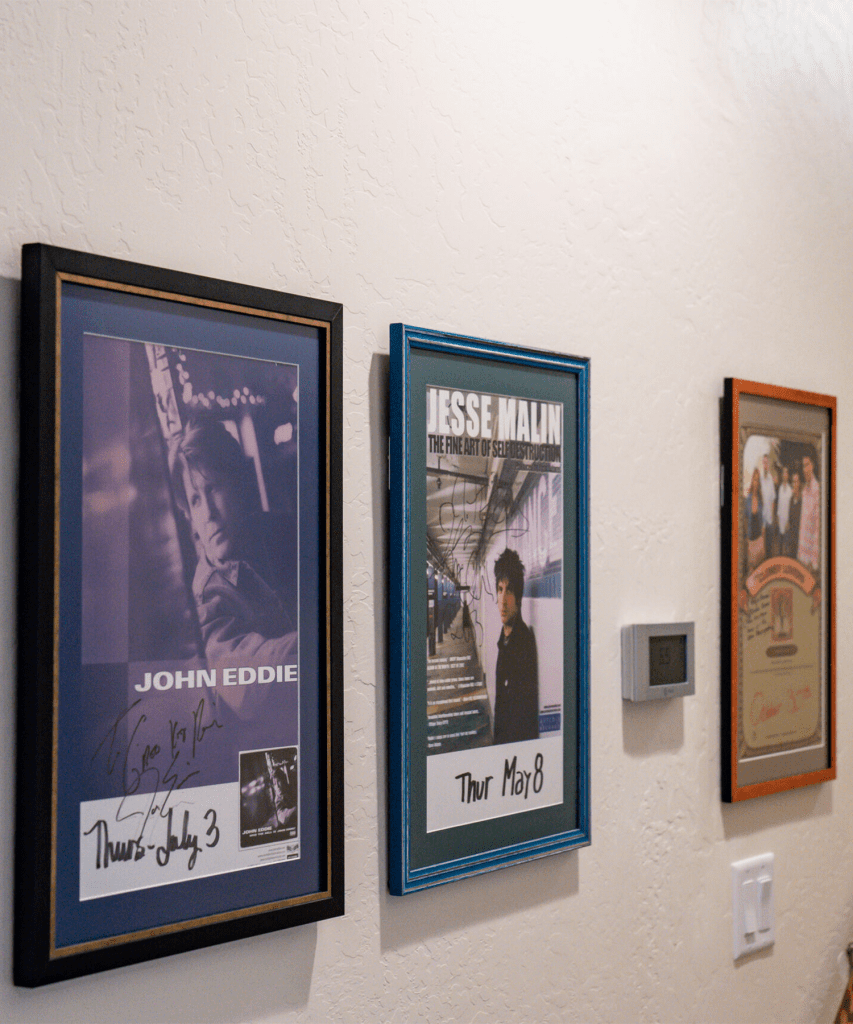 The house, furnished around the homeowner’s collection of colorfully framed vintage signed rock posters from concerts they’ve attended, has a bit of an industrial, vintage vibe. Details abound including a motional sectional covered in performance fabric, beautiful white pendants installed above the counter-height dining table, a cozy lounge/reading area using blue swivel chairs the clients already owned, boot trays at the entryways for those snowy days, privacy window coverings that let the sunshine in, and a gorgeous cream swivel chair and a desk in the study for extended stays during quarantine.