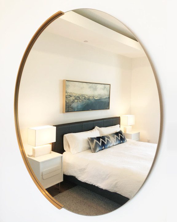 Gorgeous house that needed a few finishing touches to make it feel more like home. Guest bedroom featured an heirloom family chair that we reupholstered in a gorgeous velvet and added new legs. Dark blue leather bed with a custom silk velvet lumbar pillow. It’s all about the details. Limited images due to client privacy.